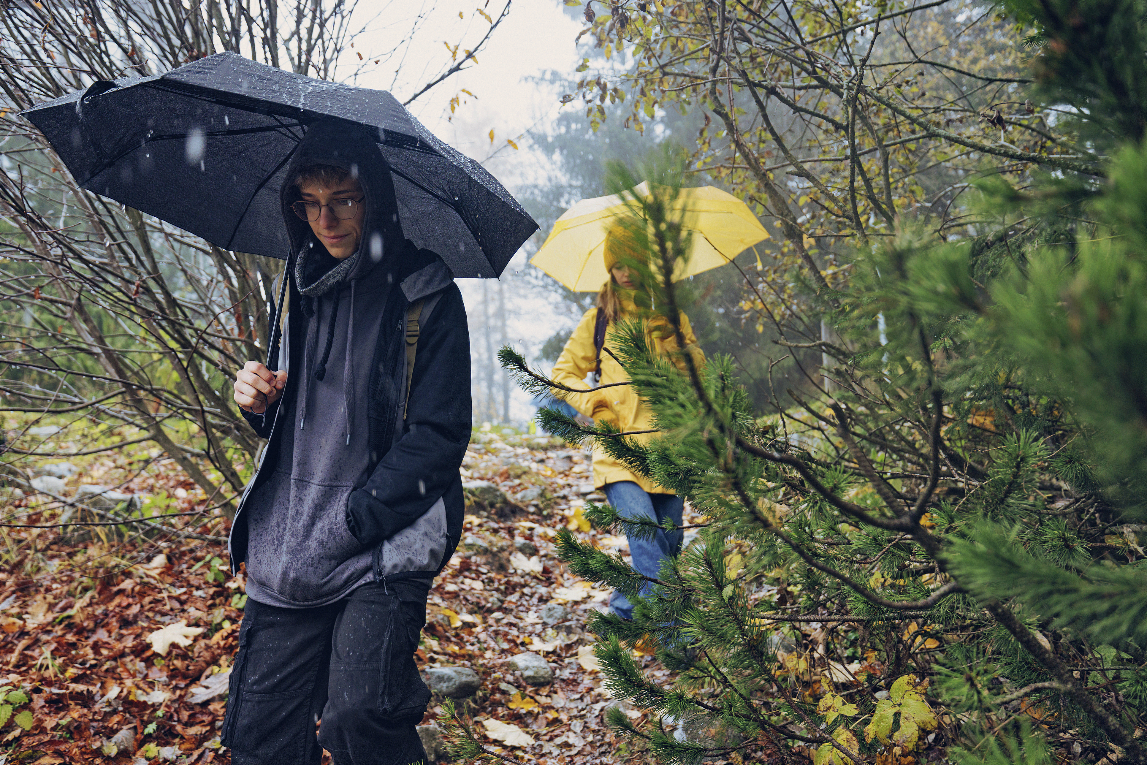 Op hakken de regen in